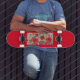 A Red 7 3/4 deck, with a Picture of Red Petunias, in the centre of it.
