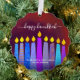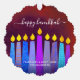 “Happy Hanukkah.” A playful, modern, artsy illustration of boho pattern candles and handwritten calligraphy script help you usher in the holiday of Hanukkah in style. Assorted blue boho candles with colourful faux foil patterns overlay a rich, brick red textured background on the front. Your favourite photo adorns the back. Feel the warmth and joy of the holiday season whenever you send this stunning, colourful keepsake paper ornament card. Personalise the custom text with your name and year and/or custom message and the photo of your choice. 5.25” square, includes ribbon to hang your card. Matching invites, stickers, pillows, wrapping paper, serving trays, home décor, and more are also available. Make this Hanukkah one to remember!