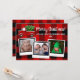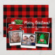 Add your 3 family or kids photos with name and year, fun Christmas greeting card. Old antique Red Pickup Truck with Christmas Tree in the bed, with script typography Merry Christmas, adorable vintage Country southern style holiday theme with red and black check buffalo plaid country pattern print like a flannel shirt.