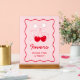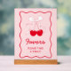 Celebrate your cherry baby shower theme with this Personalised Red Pink Bow Cherry Baby Shower Favour Acrylic Sign. Perfect for a berry sweet baby shower theme or February baby shower themes, this charming sign adds a delightful touch to your cherry on top baby shower theme and celebrates the little one who truly is "she's the cherry on top."