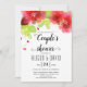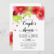 Bouquet with red ethereal flowers and cursive script handwritten calligraphy floral spring wedding couple's shower invitation. The upper part is covered with a beautiful bouquet of red and pink flowers with green leaves.