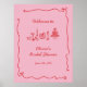 Celebrate the bride-to-be with this modern fun red and pink downloadable bridal shower welcome poster with a wavy hand drawn bow frame design and quirky handwritten font as well as a cute illustration of bridal shower food.