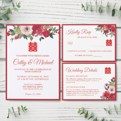 Red pink watercolor floral modern Chinese wedding Invitation