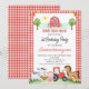 Cute red barnyard animals birthday invitation featuring a red tractor, red barn and various cute barnyard animals. Can be used for any age.