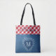 Our custom monogram tote bag will make anyone smile adorned with red plaid buffalo check and denim with a cute heart. Customise with your name and initial. View our full line of products in our Zazzle store.