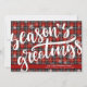 Red and black plaid with a large SEASONS GREETINGS title in a modern script typography with a dusting of snow and falling snowflakes. The back side offers a place to include additional text or simply delete the sample text to leave the area blank.