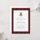 Red plaid patterned Christmas card with a cute teddy bear illustration.