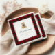 Red plaid patterned Christmas party napkin design with a cute teddy bear illustration.
