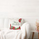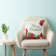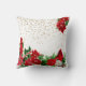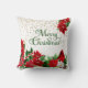 This elegant Holiday pillow features a bottom border of red poinsettia, holly, greenery, and gold embellishment. At one end is a red cardinal perched upon a white poinsettia blossom. The top right has a smaller red poinsettia bouquet, and "Merry Christmas" is in green stylised text at the centre. Everything is placed on a white background with gold star confetti. The back of the pillow has the same image without the text.