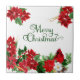 This elegant Holiday ceramic tile features a bottom border of red poinsettia, holly, greenery, and gold embellishment. At one end is a red cardinal perched upon a white poinsettia blossom. Each of the top corners has a smaller red poinsettia bouquet, and "Merry Christmas" is in green stylised text at the centre. Everything is placed on a white background. Pretty for any Holiday table, or as a festive seasonal gift.