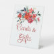 This gorgeous Christmas wedding cards and gifts sign features a beautiful watercolor of red poinsettia flowers and pine leaves for the holidays. Elegant winter wedding pedestal sign with red script for a holiday event. Pretty poinsettia floral reception decor.