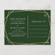 An elegant Christmas wedding save the date postcard features floral red poinsettia flowers, red berries, pine cones and greenery tree leaves, gold geometric frame and a dark green background with elegant cursive typography.