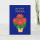 A bright, festive Christmas card with the greeting in Finnish (Hyvaa Joulea) and a gold-effect pot of Bright Red Poinsettias on a Deep Blue background with gold-effect lettering. The design is from a hand-painted paper collage by Judy Adamson and you can add your own inside message if you wish.