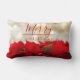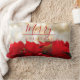 A lumbar pillow with a festive holiday photograph featuring a bouquet of red poinsettias along the bottom. Shimmering golden bokeh lights in the background. Merry Christmas written on the front in a trendy red font.