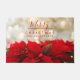 A personalised doormat with a festive holiday photograph featuring a bouquet of red poinsettias along the bottom. Shimmering golden bokeh lights in the background. Classy sophisticated style. Merry Christmas typography written in a trendy red font.