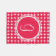 Red dots in close quarters create a secondary pattern of white stars. A large red circle is surrounded by white lines, while a single white initial graces the centre.