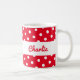 A stylish red and white mug, with a fun polka dot pattern. Personalise with the recipient's name, which will appear in red script typography on both the front and back of the design, on a white band around the mug.