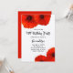 Big red poppies birthday party invitation with black text on white background. Curved text at the top, party type in larger lettering, as well as the name of the honoree. On the reverse, modern squares pattern in black and white.