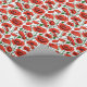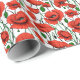 Wrapping paper in a delicate pattern of vibrant red poppies with deep green stems and leaves, on a while background, with, each poppy bloom uniquely curved and twisted, as if swaying gently in the breeze.
