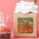 Square photo sticker of a field with red poppy flowers under old olive trees in an orchard in the countryside of Italy in summer.