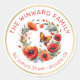 This elegant circular design features a vibrant watercolor wreath of red poppies and lush green foliage, with a delicate butterfly nestled at the center. The composition radiates warmth and natural beauty, perfect for spring and summer occasions, garden-themed events, or rustic wedding stationery. The soft painterly style and balanced layout evoke a sense of serenity and celebration, making it ideal for personalized labels with a romantic, botanical flair.
