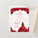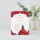 This elegant and glamourous Quinceañera birthday invitation features a beautiful princess with dark hair in a red ball gown. The text combines handwritten script and modern sans serif fonts for a classy and sophisticated look. The floral arrangements and gold confetti create the perfect blend of rustic and chic.