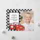 Red race car on black and white chequered flag birthday party thank you card, personalised with your child's photo and special message.