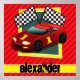 Cool, colourful kid's race car, red, yellow, chequered flag, auto racing design on Scarlet Red Stripes pattern. Perfect gift for baby, toddler, kids, children, teens, or adults! Personalised the design template by adding a child's name or custom text. Visit our store, Birthday Party House, for more great customisable boy products!