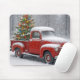A classic red pickup truck is parked in a snowy landscape, carrying a Christmas tree adorned with colourful lights