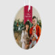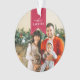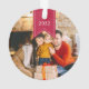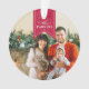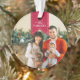 Personalise this elegant round ornament with a photo on each side to commemorate a special year. Customise the front with your family name in white on a vibrant cranberry red ribbon banner, and add the year to the back.