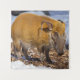 A red river hog forages for food amidst a serene white winter wonderland. Its bristly orange coat contrasts against the snow as it sniffs out nourishment.
