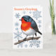 Greet the season with this delightful Christmas card, featuring a red robin bird perched on a branch and surrounded by delicate snowflakes.