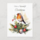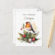 Celebrate the festive season with this winter scene: watercolor illustration of red- breasted robin perched on a branch of pine.
