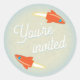 Introducing our charming Red Rockets & Moon Envelope Seal, designed to elevate your invitations to the next level. Featuring two delightful red rockets orbiting in front of a radiant full moon, this seal captures the essence of playful adventure. The inviting text "You're invited" is elegantly rendered in a bold retro script, making it a perfect finishing touch for your upcoming celebration.