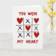 This charming greeting card turns a classic tic-tac-toe board into a sweet message about love. A hand-drawn black grid sits on a white background, with slightly uneven lines that give it a friendly, personal look. Inside the squares are four red hearts with a brushed texture and three black X’s. The hearts form a winning diagonal from the top left to the bottom right, making it feel like love has claimed the victory. Centered above the grid, the words “YOU WON” appear in bold red block letters. Below the grid, “MY HEART” is written in the same red style, completing the message in a simple, clever way. The mix of game imagery and heartfelt symbols makes this card a fun and thoughtful choice for sharing Valentine’s Day affection with someone special.❤️❤️