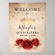 Looking for elegant ideas to create your own unique personalised welcome party signs, banners or posters for your celebration? This cool, simple DIY template is easy to add your personalised name and event details to. The original fairytale artwork by Raphaela Wilson showcases enchanting red watercolor roses with champagne yellow gold accents, a princess crown / tiara, and faux glitter sparkle foil confetti butterflies over an aged old vintage parchment paper background for a whimsical mediaeval touch. Whether you're celebrating a fairy tale wedding, once upon a time baby shower / bridal shower, magical princess sweet 16 birthday party, red quinceanera, or other special moment, these beautiful custom floral welcome posters can set the tone for your outdoor/indoor decor. Category: easy template quinceañera welcome signs with butterflies; welcome party posters with flowers; and custom size welcome welcome posters for birthday parties. Red and gold quince theme colours: burgundy, dark red, bright red, deep maroon, tan, light brown, yellow champagne gold, and black.