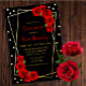 Gold and black Quinceañera with vibrant traditional red roses and classic script typography