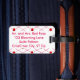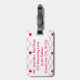 Painting of a red rose is repeated in a crisscross pattern on pink lines, on a white background, on luggage tags. There is a placeholder for contact info on the back.