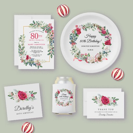 Beautiful red and white roses are nestled in holly and eucalyptus leaves to create an elegant floral display. They decorate a wide gold frame and are dappled with gold confetti dust. 80th birthday celebration and the person's name is written in a large red text. There is more room on the back of the postcard to create a special message to your guests. All of the text can be edited. Perfect choice for a special winter birthday celebration.