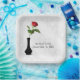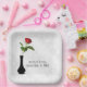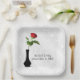 A single red rose in a black vase on shimmering white damask background for a wedding, anniversary, or vow renewal reception.