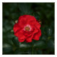A photograph of a red rose in a garden. The blossom is fully open exposing the yellow stems of the centre. A pair of red buds are growing behind the main flower. The background is full of green leaves. Image Copyright ©Kimberly J Tilley.