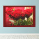 The canvas features a vivid red rose with lush green leaves set against a rich dark red background. The deep tones of the background enhance the rose's vibrant colour, creating a striking and elegant visual effect. This artwork is perfect for adding a bold and sophisticated touch to any room.