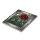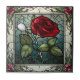 The Red Rose with Vine Border Stained-Glass Look Ceramic Tile features a single elegant red rose on a background of grey-blue with a rose vine border. This tile has an antique stained-glass look done in the Art Neveau style. This design is also available in a mirror image. There are many wonderful applications for these beautiful tiles.