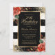 Elegant black and white striped floral 70th birthday invitation featuring a gold frame decorated by gold confetti, red roses and greenery.