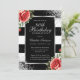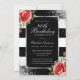 Elegant black and white striped floral 80th birthday invitation featuring a silver frame decorated by silver confetti, red roses and greenery.