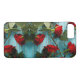 A phone case with a pattern of red roses with green leaves and stems on a blue wooden background. The roses are arranged in a scattered pattern, with some roses fully bloomed and others still in bud. The wooden background is a light blue colour with visible wood grain. The overall style is romantic and floral.
