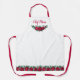 White floral apron with hand-drawn red roses, baby's breath, and rose leaves in green. Personalise with your name in a pretty script. Red rose apron in white and red. Floral apron personalised with your name in a red script.