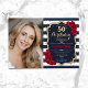 Elegant floral feminine 50th birthday invitation with your photo. Glam navy white red design with faux glitter gold. Features navy blue and white stripes, red roses, script font and confetti. Perfect for a stylish adult bday celebration party. Personalise with your own details. Can be customised for any age! Printed Zazzle invitations or instant download digital printable template.