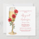 Gold glitter image back. Red Roses on Champagne Shower bridal shower invitation. Name in red modern script. Red text. Watercolor image. Red bridal shower. Red roses shower.