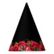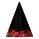 This party hat is shown with Red rose garland with Green butterflies along the bottom edges of this Black party hat.